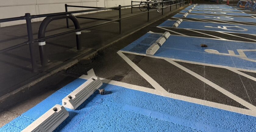 某施設駐車場にて、車止めラインの再塗装工事を行いました。